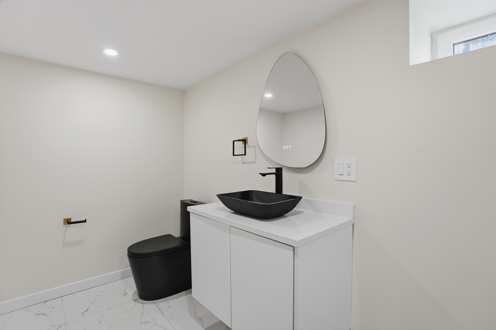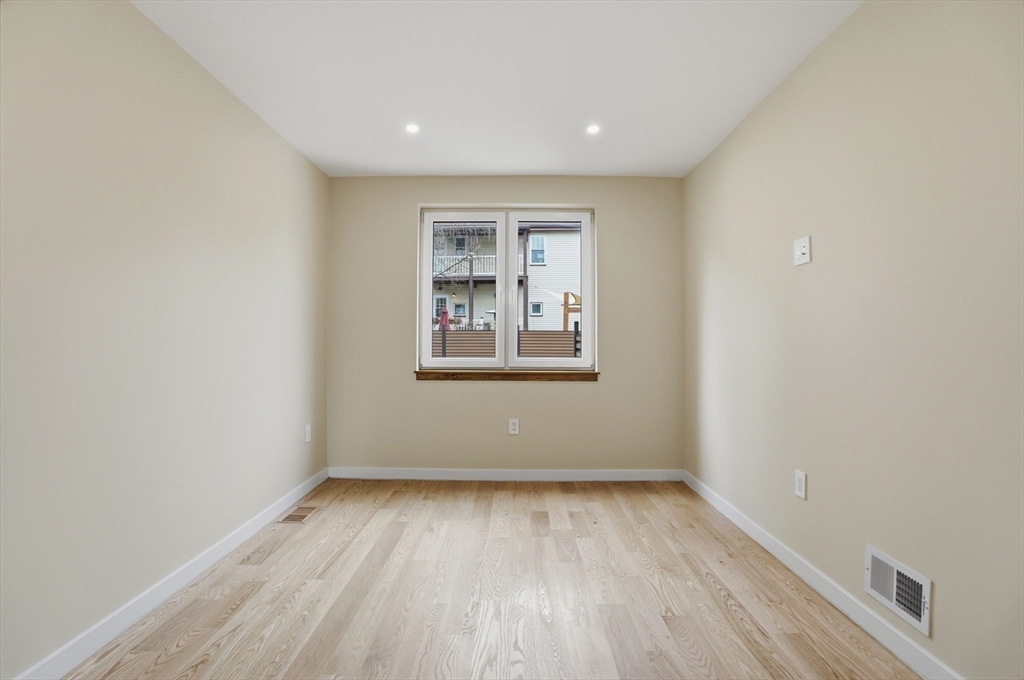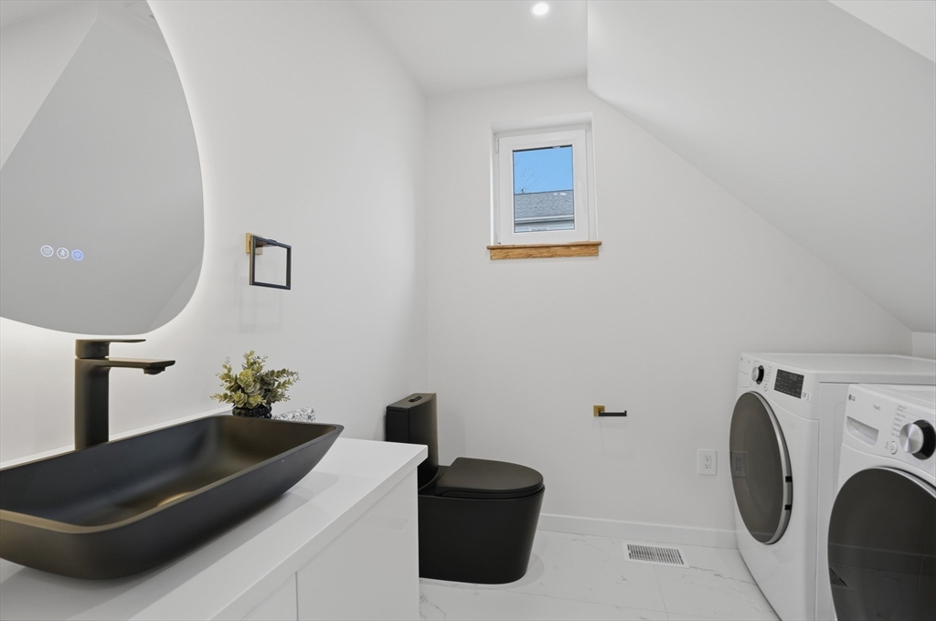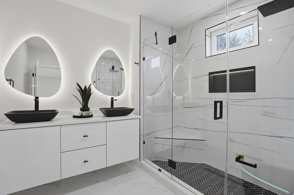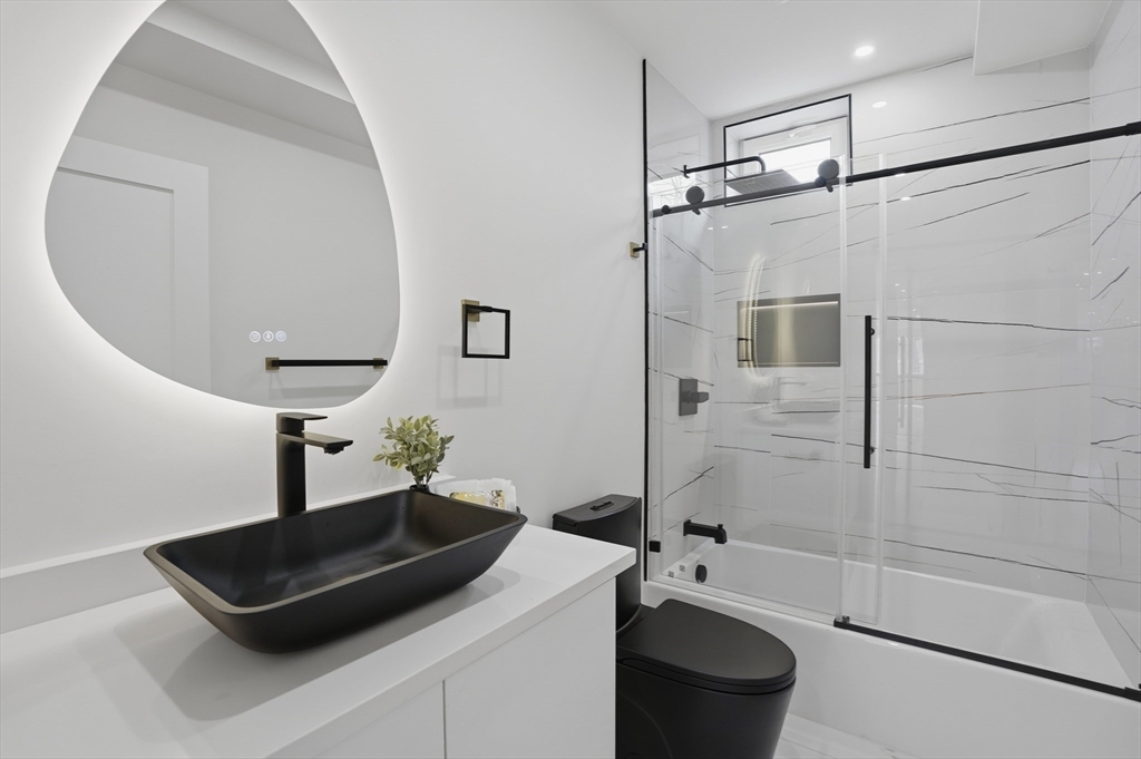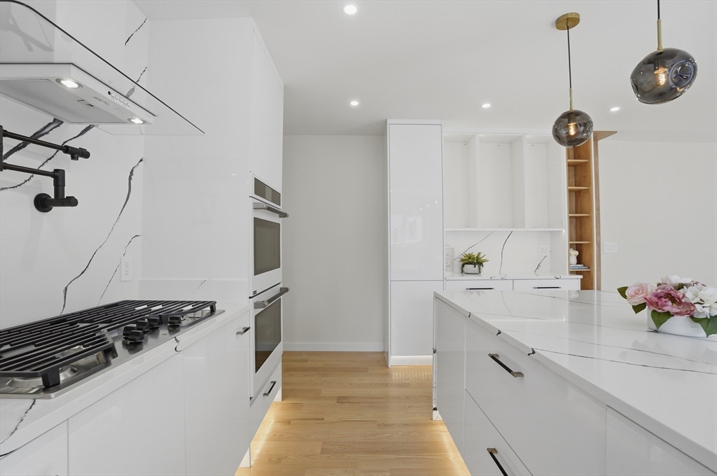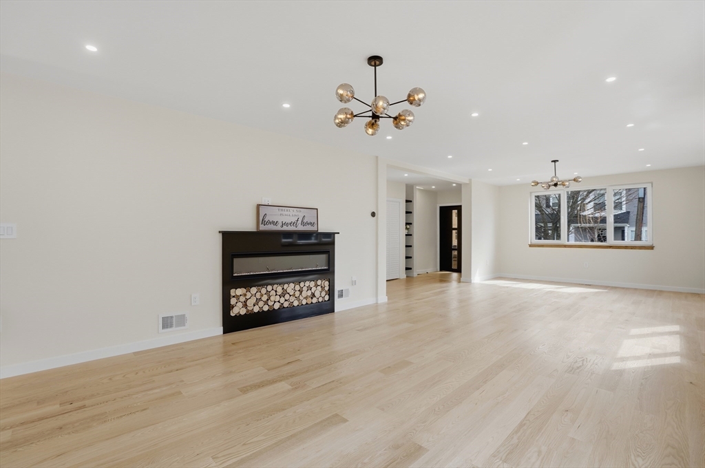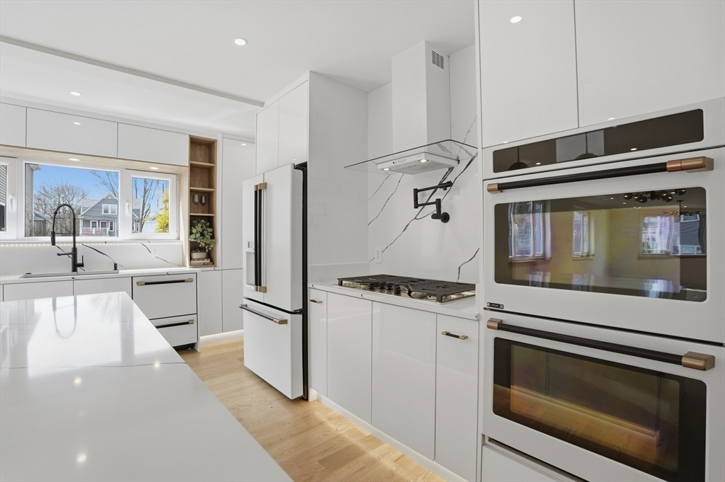BEAUTIFULLY RENOVATED first-level home offering refined single-level living with modern finishes and exceptional natural light throughout. The open-concept living and dining space is bright and inviting, featuring a fireplace and oversized windows, flowing into a thoughtfully designed kitchen with a large center island, stone surfaces, custom cabinetry, and premium appliances - ideal for everyday living and effortless entertaining. The primary suite features a sleek full bath, while two additional bedrooms offer flexibility for guests, a home office, or a tailored lifestyle. Additional highlights include hardwood floors, central air, in-unit laundry, garage and off-street parking, and private outdoor space. Ideally located near Main Street shops and dining, Watertown Square, Arsenal Yards, the Charles River Greenway, and easy access to Routes 20, 16, and the Mass Pike for commuting into Boston.